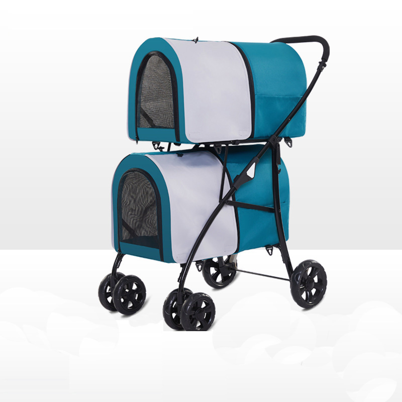 El cochecito doble para mascotas funciona como cochecito, bolso de transporte, asiento de automóvil y jaula para mascotas para un uso flexible.