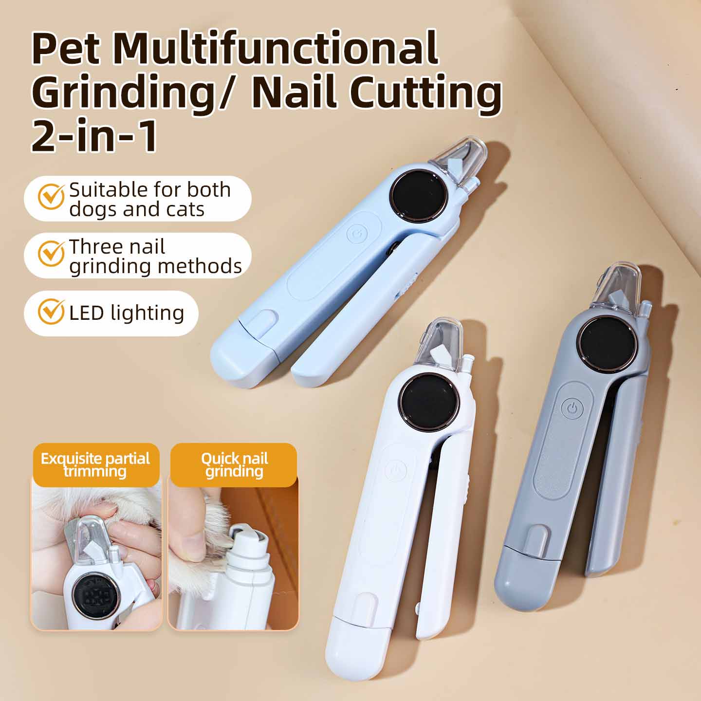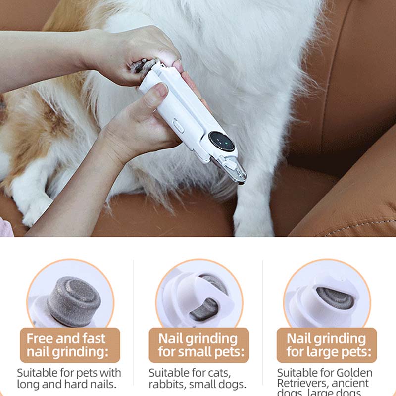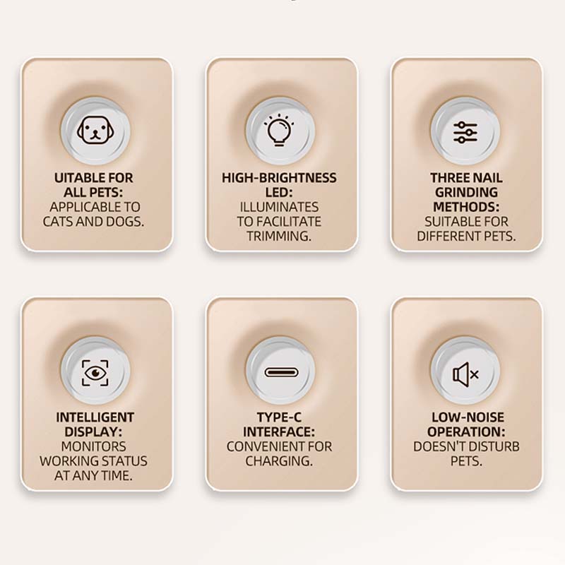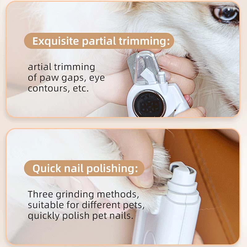 1. Luz LED incorporada La luz LED integrada proporciona una visibilidad clara durante el aseo, evitando el recorte a ciegas y protegiendo el pelaje de su mascota de posibles lesiones. 2. Monitorización de pantalla inteligente La pantalla inteligente monitoriza en tiempo real el estado de funcionamiento, incluyendo el nivel de batería y el modo de funcionamiento, lo que permite conocer el estado del dispositivo de un vistazo. 3. Función de rectificado profesional: El cabezal de pulido de alto rendimiento pule suavemente los bordes afilados de las uñas, proporcionando un acabado pulido delicado, como de salón de belleza, para perros y gatos de todos los tamaños. 4. Carga conveniente mediante tipo C: La interfaz universal Tipo-C permite una carga rápida y sencilla en cualquier momento y lugar, eliminando la molestia de tener que reemplazar la batería.